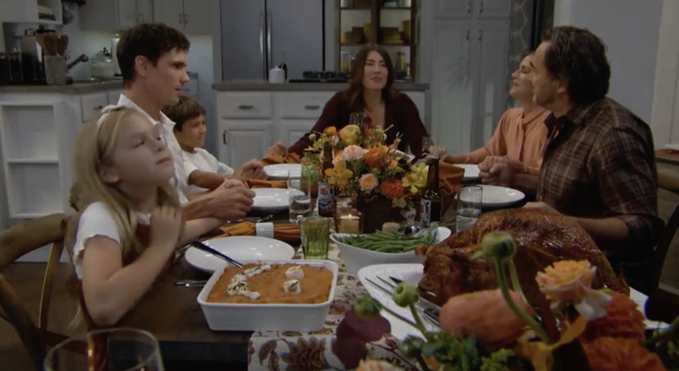 Meanwhile at the cliff house, the Thanksgiving lunch wraps up. Ridge helps Steffy put away dishes as Taylor chats with Kelly about art projects. No one suspects the fury waiting for Ridge at home.