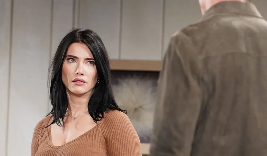 Steffy turns to him when his voice rises. She tries to calm him, reaching for his arm, but he pulls away.