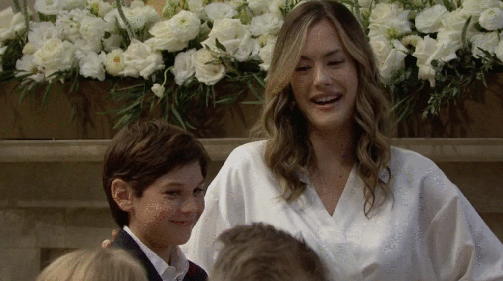 Upstairs, Donna and Katie are helping Hope prepare. They’re fixing her hair, touching up makeup, adjusting jewelry — all the classic sisterly wedding prep moments. Katie jokes about crying too early, Donna gushes about Hope looking like an angel, and Hope expresses how lucky she feels to have the Logan women as her support. It’s a calm, feminine, loving moment before the ceremony.