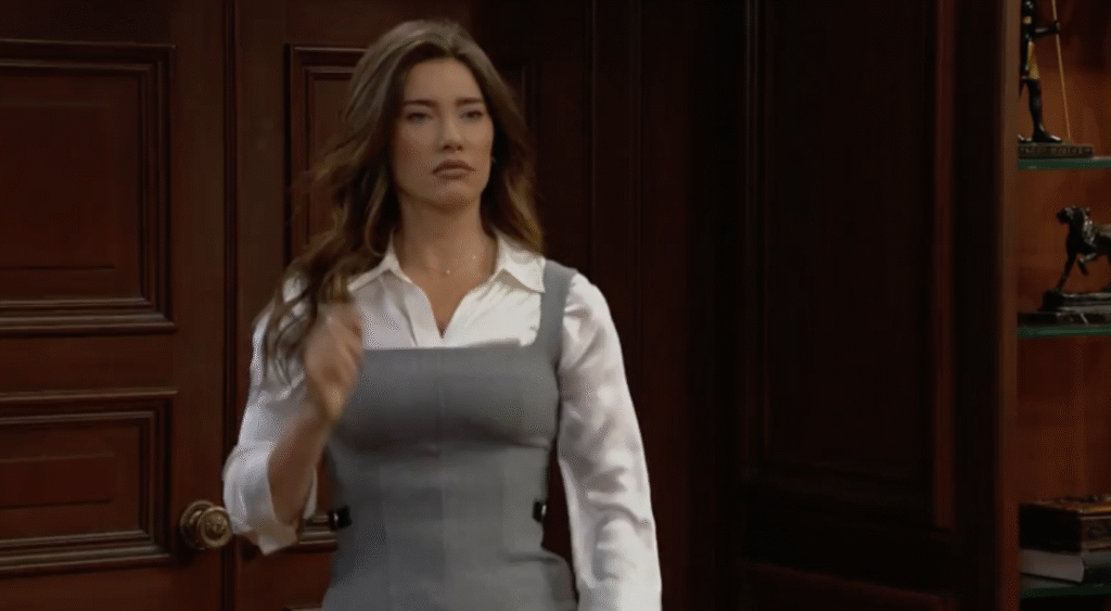 Back at Forrester Creations, Steffy and Ridge regroup once more. Steffy presses Ridge again about missing the wedding. Ridge deflects, saying it’s best he stays away to avoid stirring up tension. But Steffy gently urges him to think about healing, not hiding.