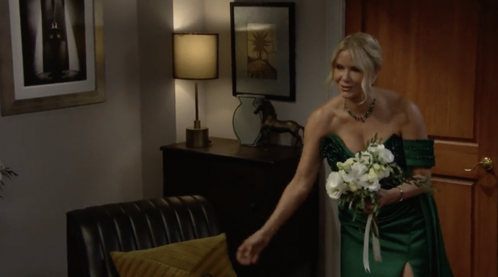 The doorbell rings, and Liam opens it to find Bill, sharply dressed and ready to step into proud-father-in-law mode. Bill looks around at the decorations and actually compliments Liam and Hope on how beautiful everything looks. He gives Liam a firm pat on the back and even softens enough to call Hope “a glowing bride” before joking that she should run while she still can. Everyone laughs, easing the pre-ceremony jitters.